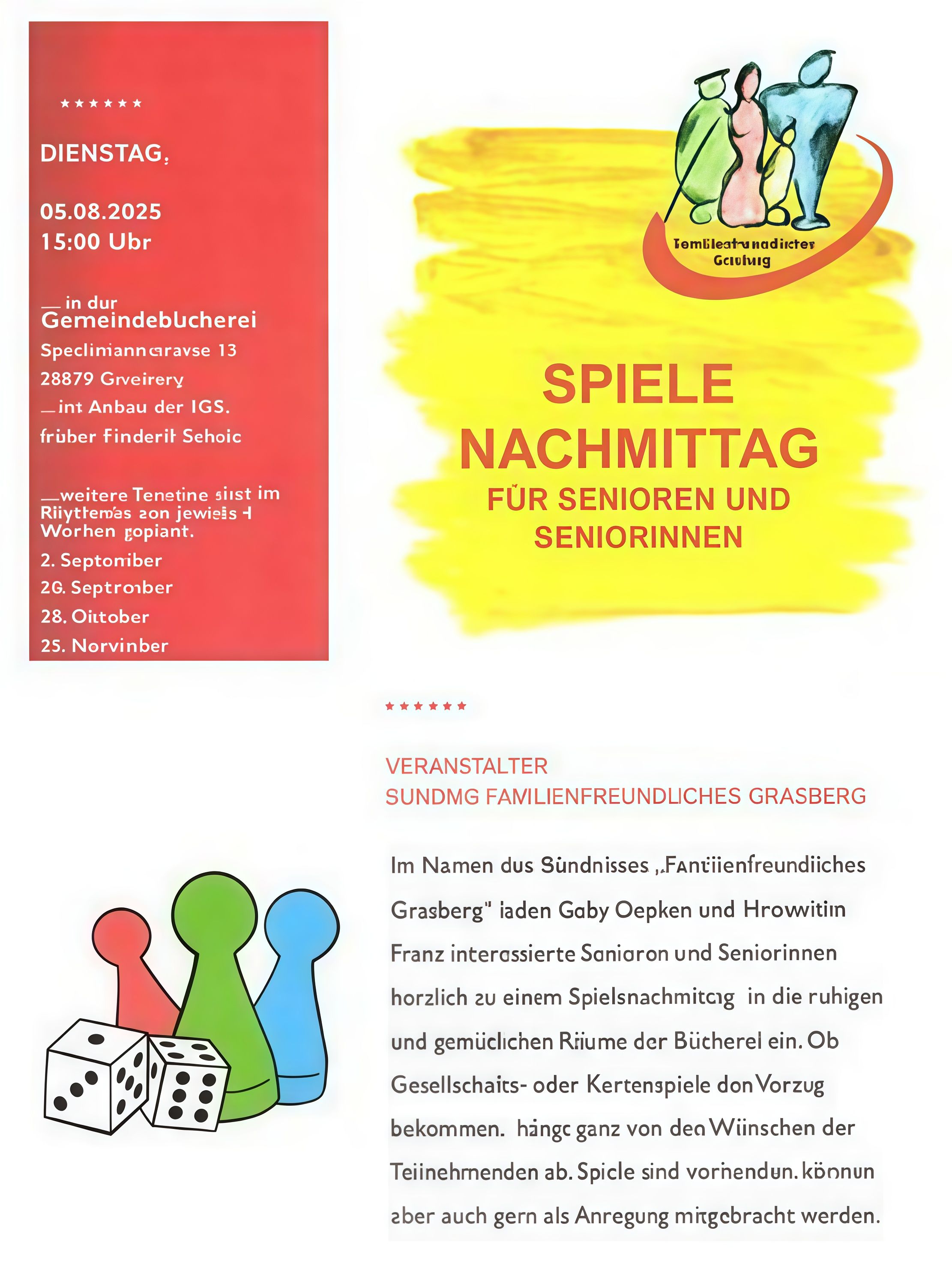 Im Namen des Bündnisses „Familienfreundliches Grasberg“ laden Gaby Depken und Hroswitha Franz interessierte Senioren und Seniorinnen herzlich zu einem Spielenachmittag in die ruhigen und gemütlichen Räume der Bücherei ein. Ob Gesellschafts- oder Kartenspiele den Vorzug bekommen, hängt ganz von den Wünschen der Teilnehmenden ab. Spiele sind vorhanden, können aber auch gern als Anregung mitgebracht werden.